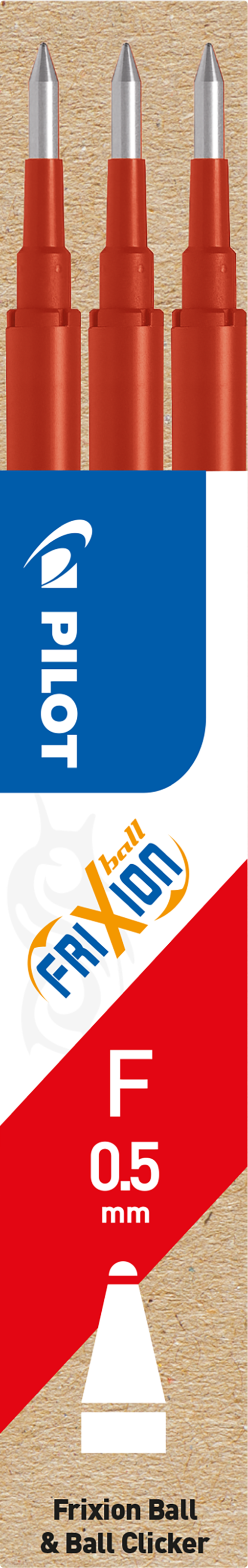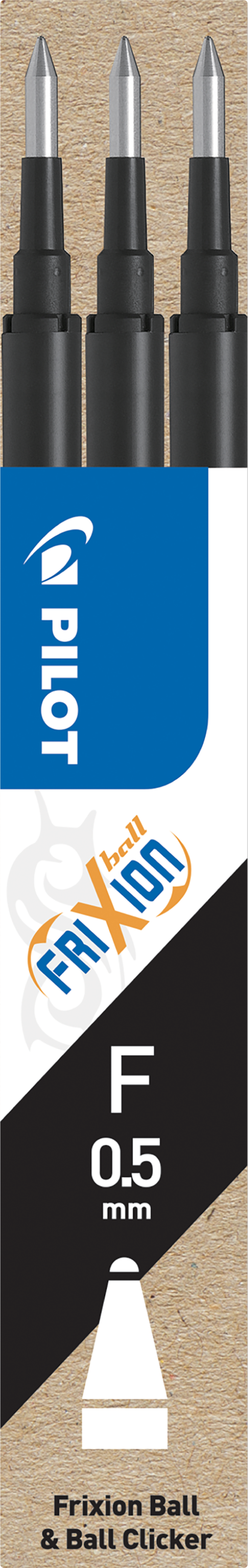 Refill med värmekänsligt bläck som kan raderas omedelbart med Frixions särskilda raderingstopp. Den tunna spetsen på 0,5 mm är perfekt för uppgifter som kräver exakt precision. Passar Pilot Frixion Clicker och Pilot LX. 3 st/förp.