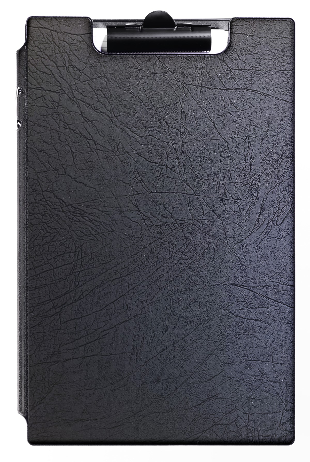 Stadigt blockomslag för A4+ format av plastöverdragen kartong Halvcirkelformade fickor på insidan för lösa papper och visitkort Kraftig metallklämma som håller blocket på plats Mellanlägg för skydd av bladen under det som det skrivs på Inbyggd hållare för en penna