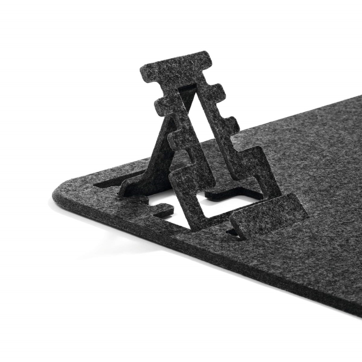 Skrivunderlägg tillverkad av 60% återvunnen PET filt med uppfällbar mobilhållare. Underläggets behagliga yta ger en skön skrivkänsla och skyddar samtidigt bordet mot repor och märken. Mobilhållaren kan enkelt fällas upp och tryckas ner igen i mattan utan att den syns och underlägget kan vikas ihop på mitten, perfekt för ett hemmakontor Skrivunderlägget är tillverkat av ett material som är lätt att hålla rent. Ytan kan torkas av med en fuktig trasa. Filtmaterialet är ljuddämpande och har därmed en positiv effekt på akustiken. Hållbar förpackning: utformad för att spara resurser och fri från plast.