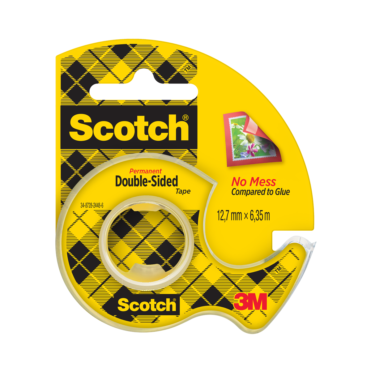 Scotch® Dubbelhäftande tejp är belagd med permanent häftämne på båda sidor och håller ihop saker utan att synas. Den här dubbelsidiga tejpen är ett idealiskt kladdfritt alternativ för att fästa lättare material, snabba lagningar eller tillägg till dina projekt. Scotch® Dubbelhäftande tejp är kraftig, håller länge och är fotosäker, och den torkar inte ut eller gulnar med tiden.