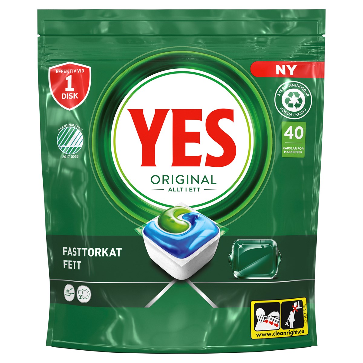 Yes Original All in One diskmaskinstabletter är effektiva även mot intorkat fett och ger en skinande ren disk. Yes kombinerar vätska och pulver i en enda kraftfull kapsel. Det ytterst lättlösliga höljet löses upp fort så att kapseln kan börja rengöra och utföra sitt jobb. Och de är så enkla att använda! Ingen uppackning behövs, lägg dem bara i diskmaskinens diskmedelsbehållare.