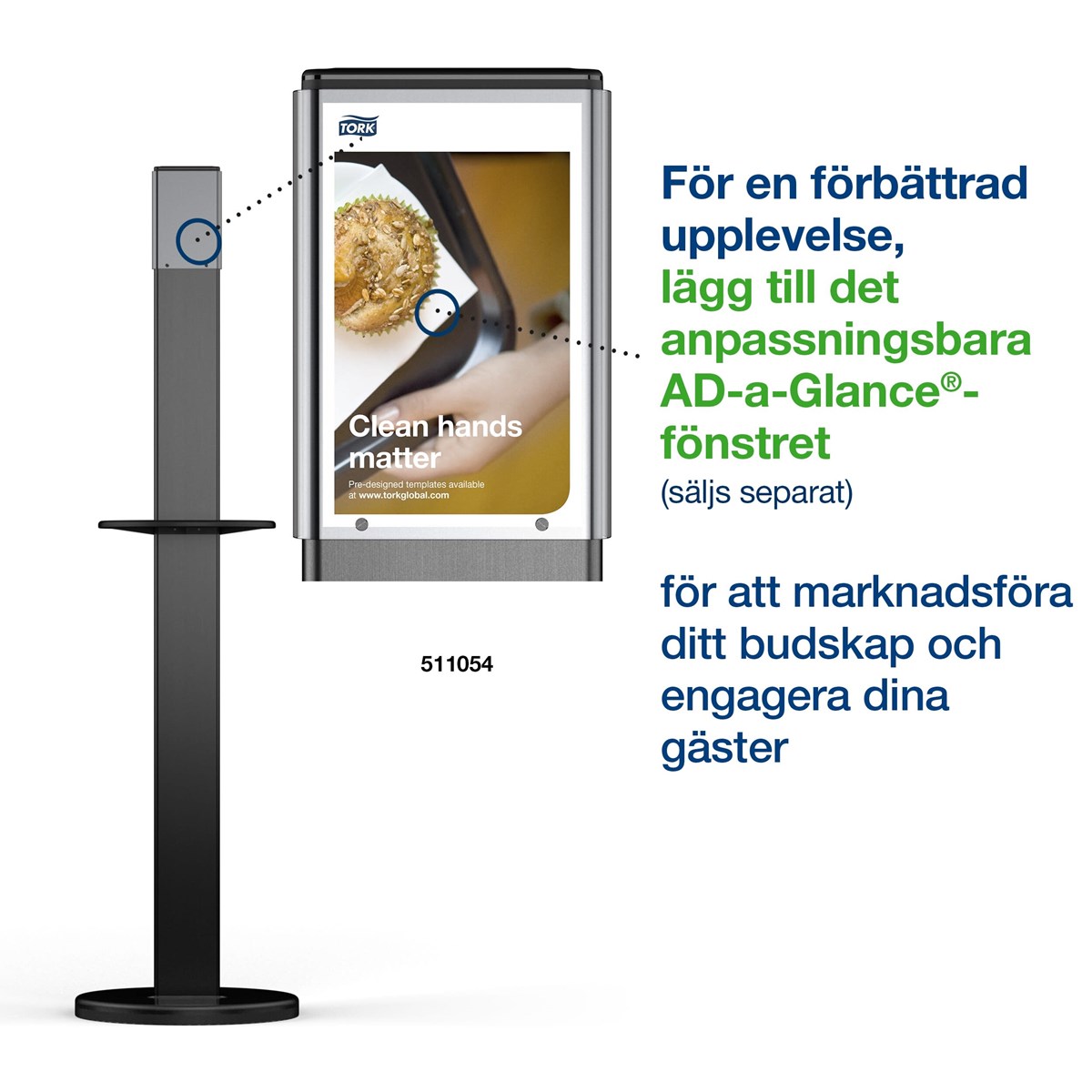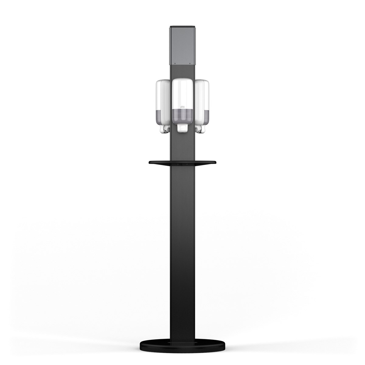 Stabilt golvställ som hjälper till att förbättra hygienen för anställda, gäster och besökare genom att ha handdesinfektion och servetter nära till hands. Plats för tre dispensrar. Passar Tork hållare S1, S2, S4 och F1. Mått ställ: 167,6 x 47 cm. Informationsfönster som träs på toppen med plats för ditt eget budskap finns som tillbehör.