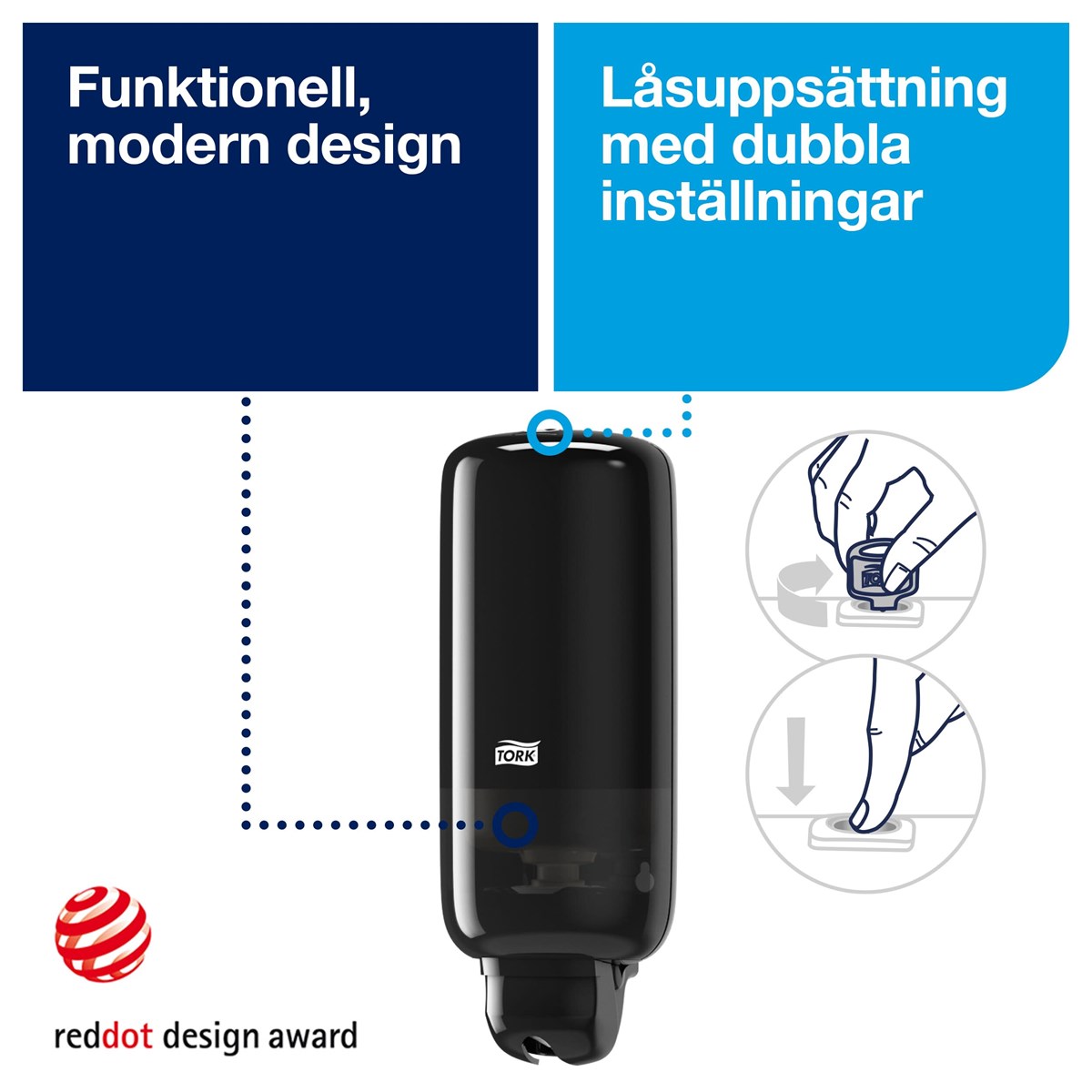 Snygg tvålhållare, lämplig för krävande miljöer. Hög kapacitet, upp till 1000 handtvättar/tvålflaska. Mått: H29,1 x B11,2 x D11,4 cm.