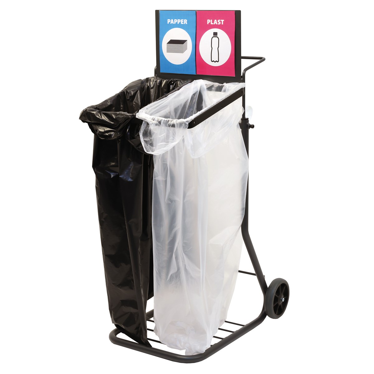 Robust säckvagn på hjul för sopsortering. Kan märkas upp med skylt för specifik sortering, 8 st olika A4- och A5-skyltar medföljer. 2 st extra säckbyglar medföljer (för att kunna ha två sorteringsmöjligheter på samma vagn). Mått: (L x B x H): 58 x 46 x 111 cm.