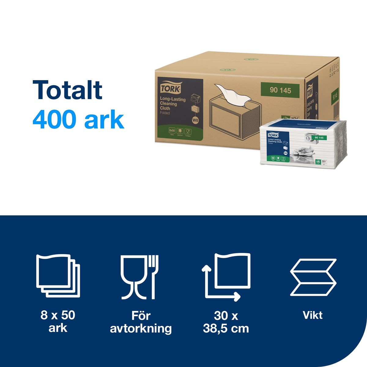 Tålig och slitstark rengöringsduk av non-woven-material med hög absorptionsförmåga. Hygienisk ersättare till disktrasan. Godkänd för livsmedelskontakt. Mått : 38,5 x 30 cm. 50 vita dukar/förp. 400 dukar/kartong.