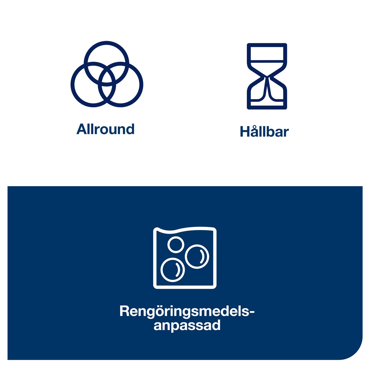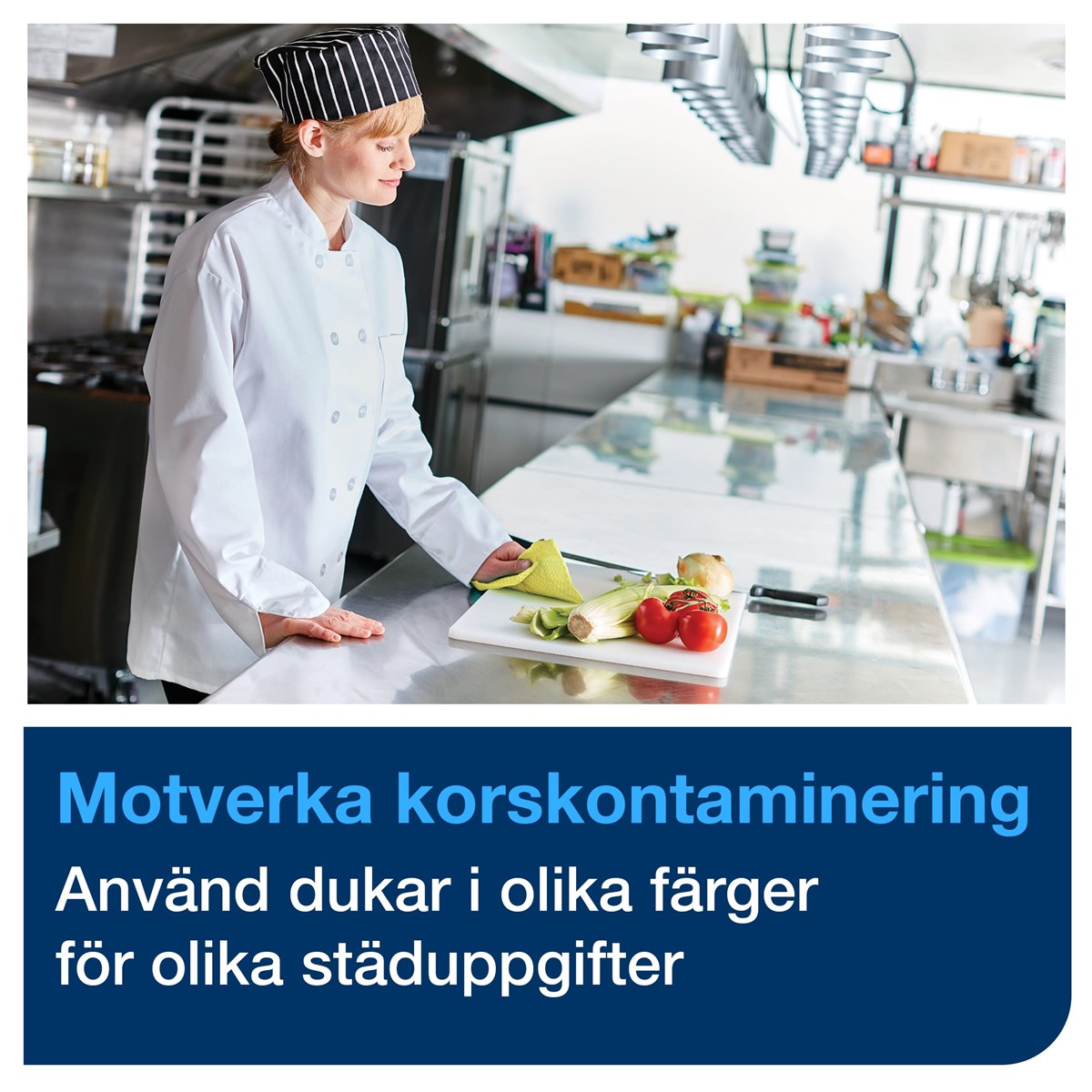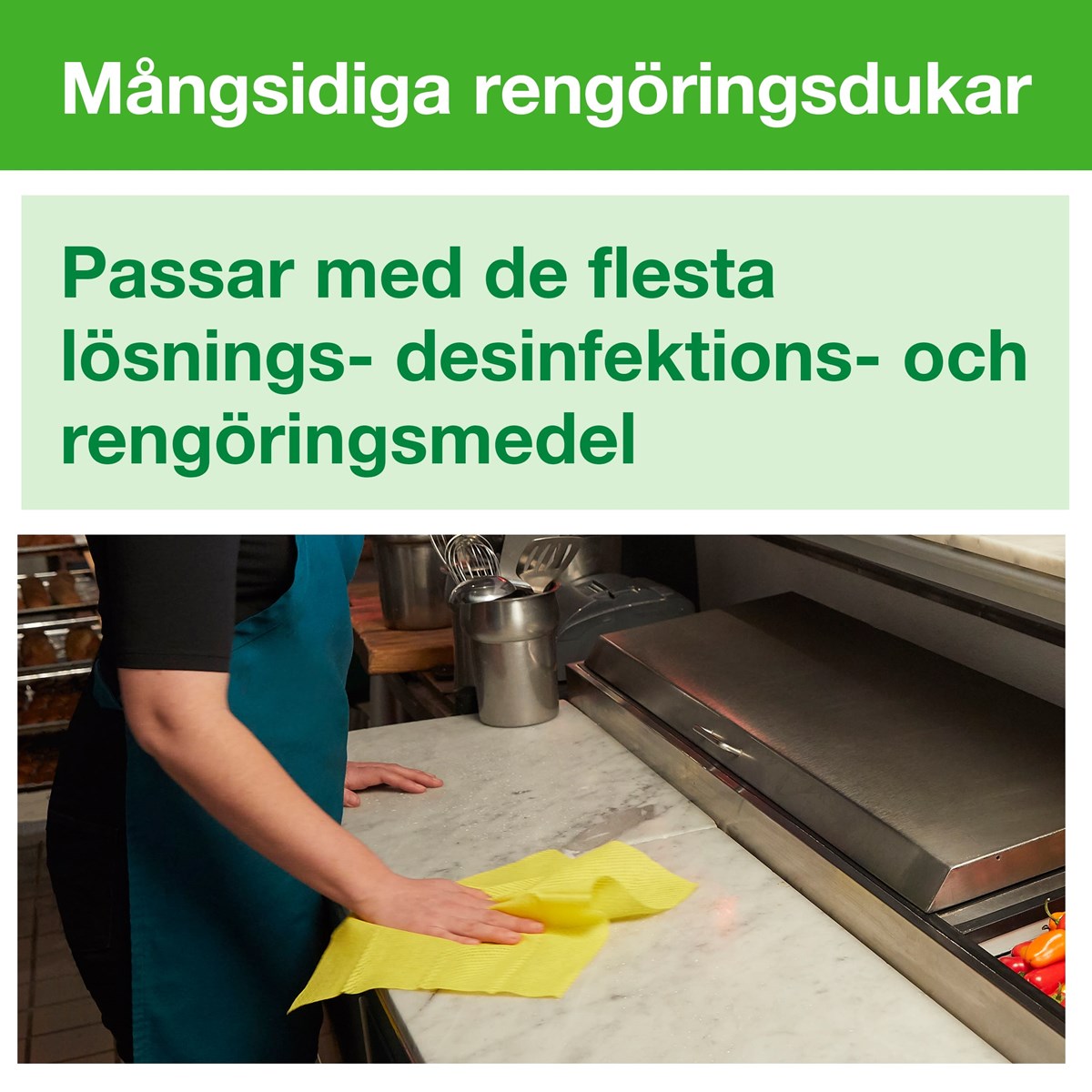 Allround-kvalitet som kan hantera allmän avtorkning Stark och absorberande Tillgänglig i fyra färger för att förhindra korskontaminering Lämplig för användning med de flesta rengöringsprodukter