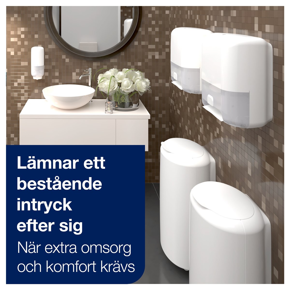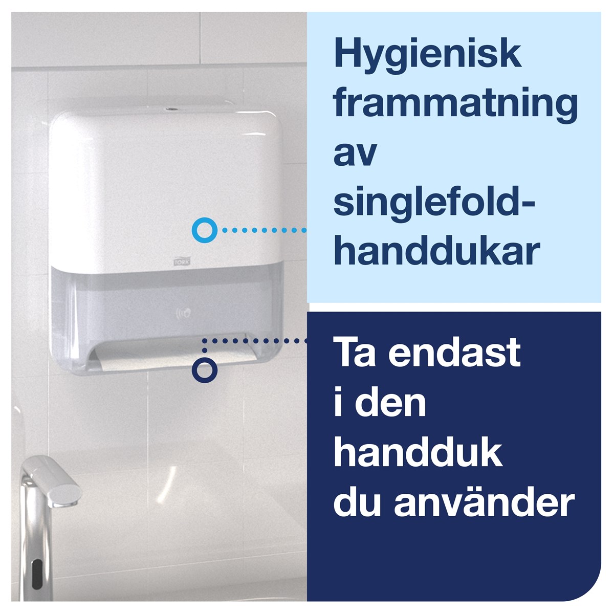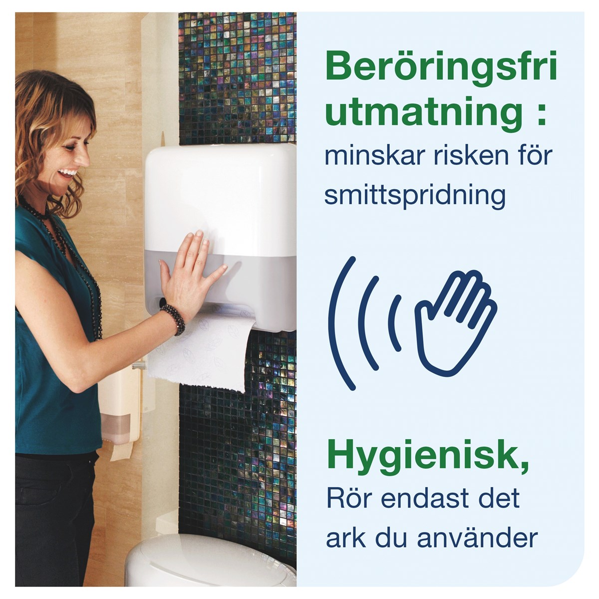 Sensorstyrd vit hållare för handduksrullar. Känner av besökarens händer och matar då fram en handduk. Enkel och snabb påfyllning. Hög kapacitet, idealisk för trafikerade toalettutrymmen i olika miljöer. Drivs med 3 st LR20-batterier. Mått: (H x B x D) 36,8 x 33,1 x 20,6 cm.