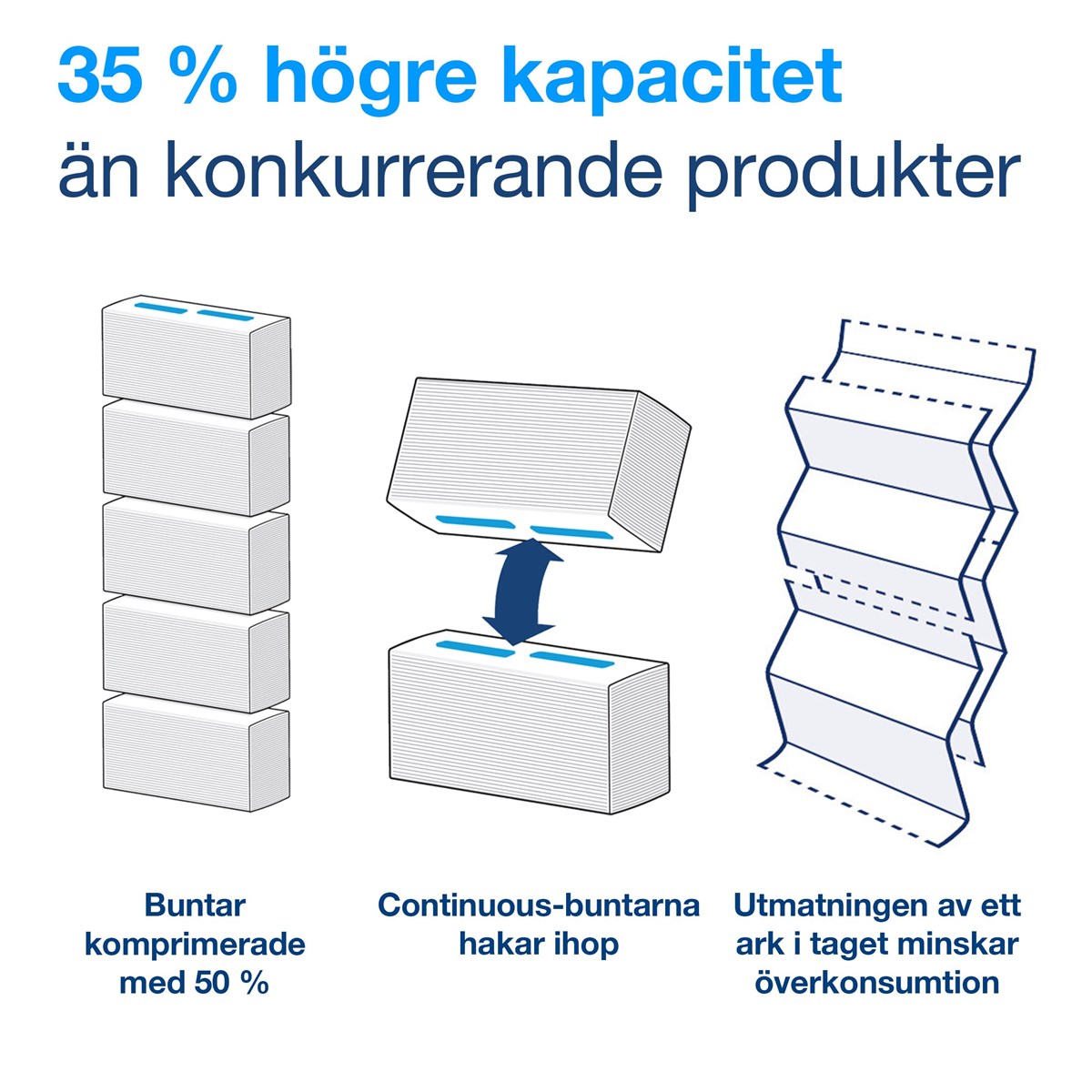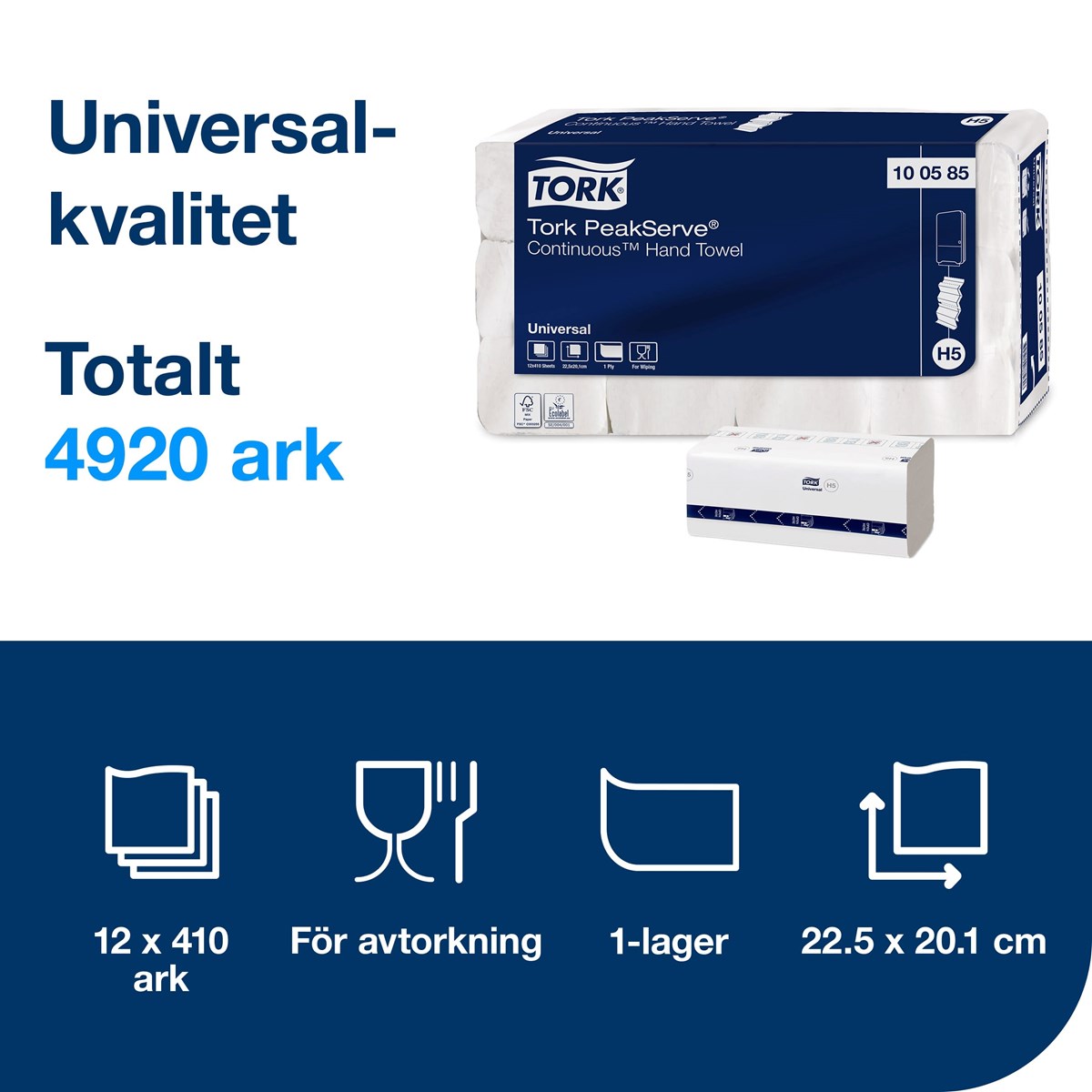 1-lags vita handdukar av baskvalitet (Universal). Buntarna är komprimerade med 50% så att det får plats dubbelt så många på mindre yta. Buntarna greppar in i varandra när de fylls på så att de fortsätter matas ut en i taget utan avbrott. Detta ger hög kapacitet och färre påfyllningar samt bättre genomflöde i toalettutrymmena. Det finns alltid en tillgänglig handduk som är lätt att ta tag i och dra ut. Mått: 22,5 x 20,1 cm. 410 st/bunt, 4920 st/förp. Passar till Tork hållare H5.