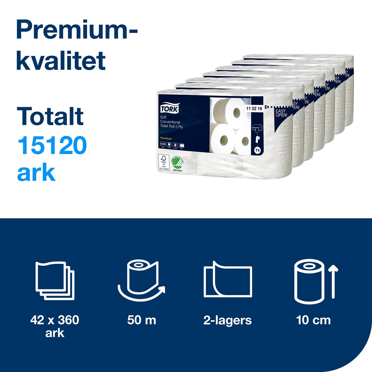Ge dina besökare samma komfort som hemma med Tork toalettpapper i premiumkvalitet. Mönstrad prägling för ett lyxigare intryck och en mer gedigen känsla 2-lags. Extra mycket på rullen. 50 m/rulle. 42 rullar/förp.